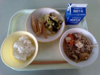 12月23日の給食 公開日 2024/12/23 更新日 2024/12/23 メール用カテゴリ 今日の給食は、 ごはん ぎゅうにゅう きびなごのさくさくあげ かいそうサラダ あつあげのちゅうかにこみ です。 今日は2学期最後の給食でした。今日もおいしくいただきました。