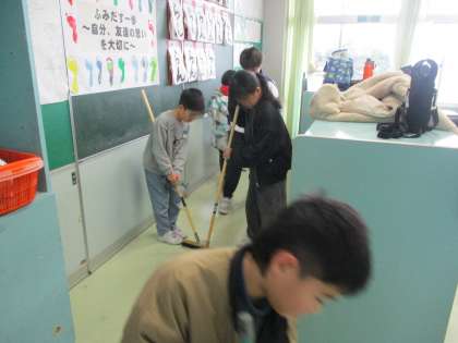 各学級では、毎日使っていた机・椅子だけでなく、黒板、棚の裏側等普段あまりできない場所まで細かく掃除をしました。また3学年では、新年度に向けて壁に貼っていたクリスマスオーナメントを外し、来年の干支の蛇の作品を飾りました