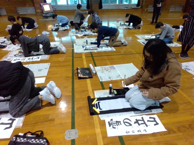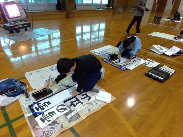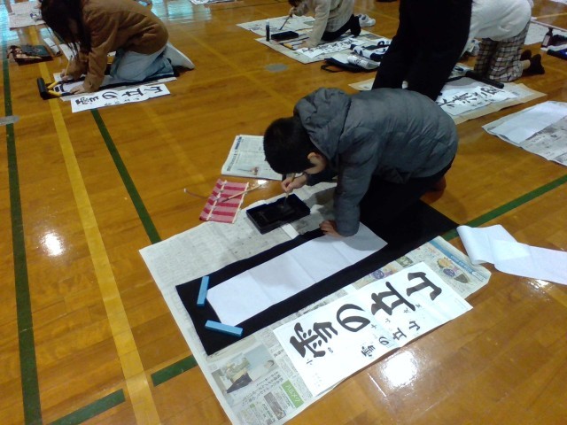 書き初め大会を行いました。12月から練習した成果を発揮できるよう集中して取り組みました。