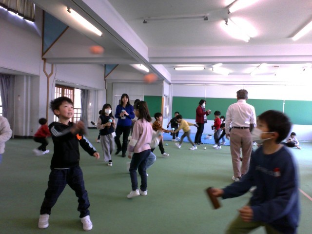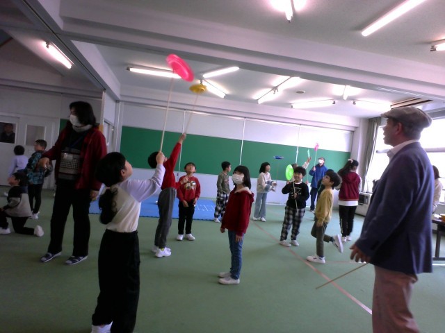 2年生 遊びの教室 公開日 2025/01/21 更新日 2025/01/21 2年生 「富山子ども遊ばせ隊」から講師の先生をお招きし、1年生・2年生合同で遊びの学習をしました。空気砲遊びや皿回し、筒けん玉やけん玉積み等、たくさんの遊びを教えていただきました。最初はなかなかうまくできなかった子供たちも、失敗にめげずに何度も挑戦し、みるみるうちに上達していきました。 2年生