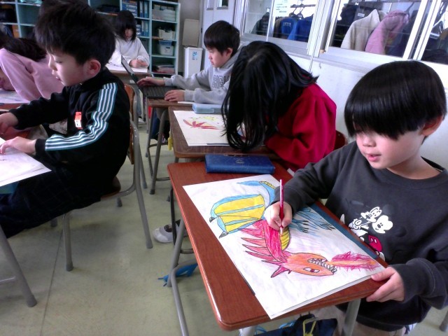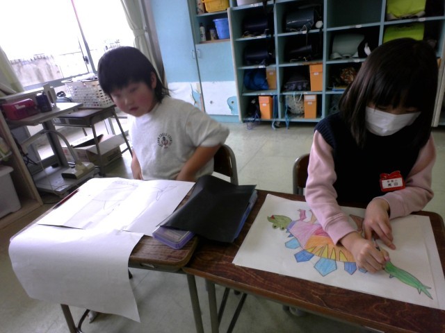 2年生 図画工作科「紙版画」 公開日 2025/01/27 更新日 2025/01/27 2年生 2年生の今年の版画の題材は「わたしのきょうりゅう」です。いたらいいな、遊んでみたいな、と思う恐竜をデザインし、カラー版画に表します。今日は下書きをカーボン紙の上でなぞって台紙に写しました。線が、描いたとおりに複写されることに感激し、面白さを感じながら写し取りました。 2年生