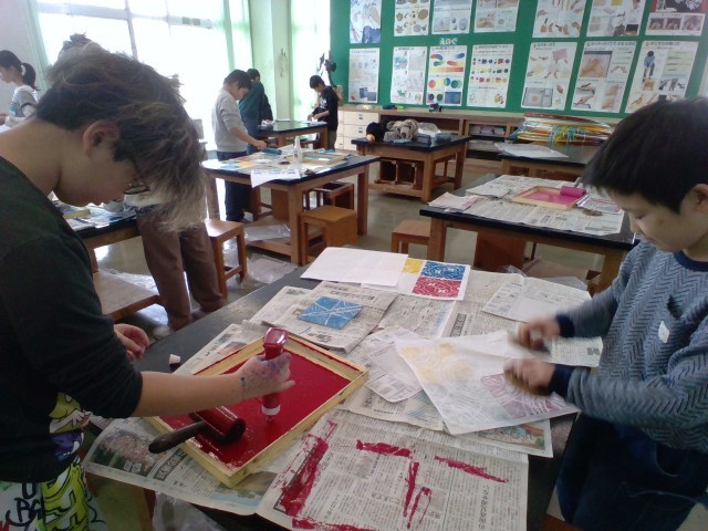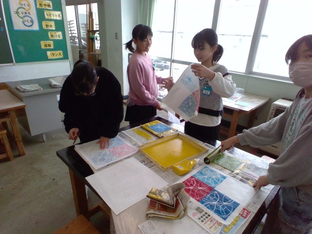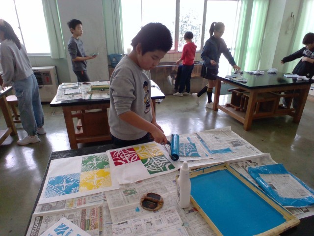 図工の学習で版画を作っています。彫った板を紙に写し模様を作りました。きれいな作品を作ることができました。