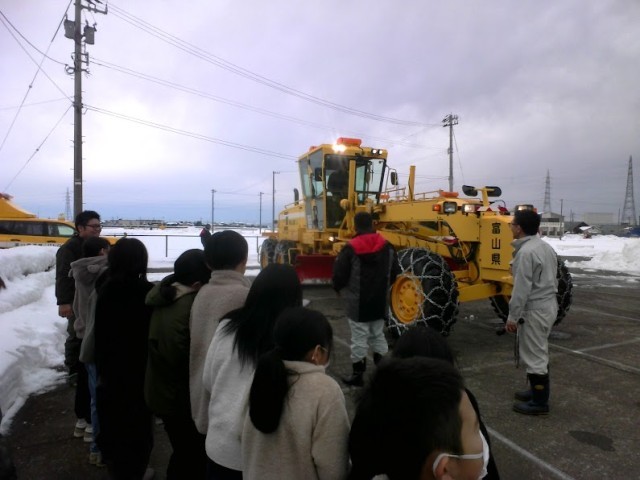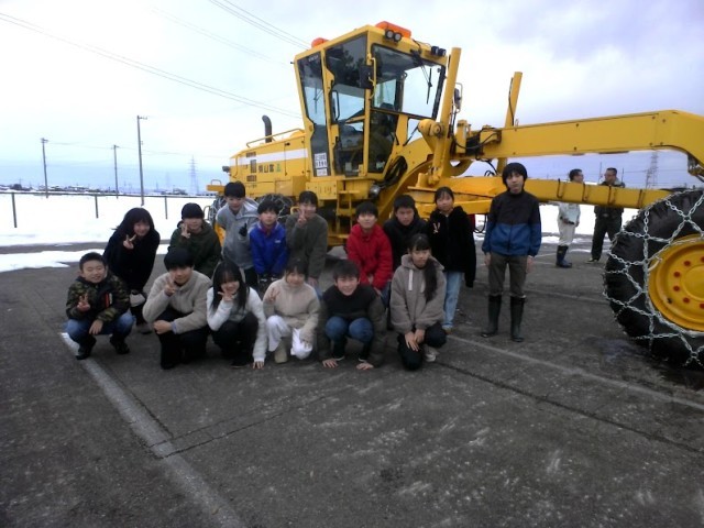 こども雪教室では、県内の降雪状況のグラフや大雪の日の写真を見て、安全な暮らしをするには、道路の除雪が欠かせないことを知りました。そのあと子どもたちは屋外に出て、除雪機械を見せていただきました。間近で見る除雪機は大きく、いっきにたくさんの雪を除雪する様子に圧倒されていました。