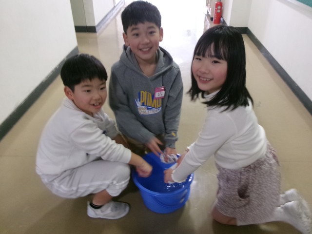 寒い時期に大変ですが、子供たちは、変わったこと?が大好きで、「やった!今日も水拭き!」と笑顔で取り組んでいます。
