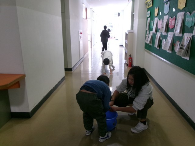 来週からのワックスがけに向けて、清掃時間に廊下や教室の水拭きをしています。