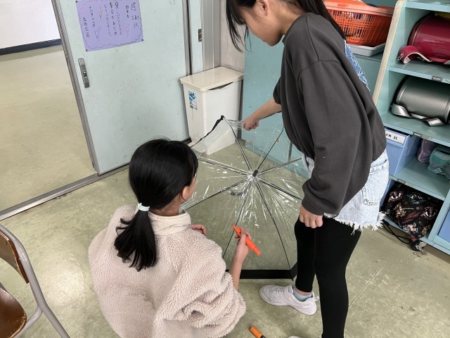 傘作りをしました。傘にカラフルな文字を書いて装飾しています。どのようなものができるのかとても楽しみです。