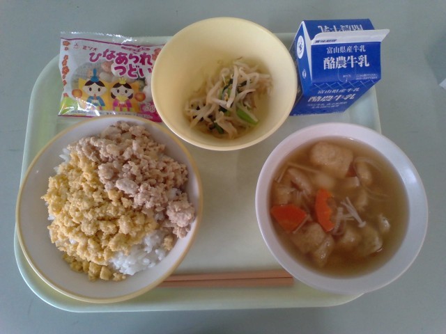 2月28日の給食 公開日 2025/02/28 更新日 2025/02/28 給食 今日の給食は、にしょくどん(ごはん、とりそぼろ、いりたまご)しらたまじるなばなびたしぎゅうにゅうひなあられ です。今日はひなまつり献立でした。今日もおいしくいただきました。 給食