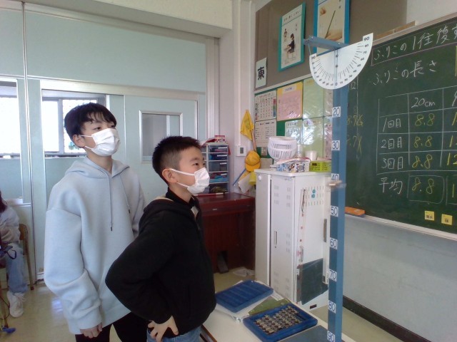 ふりこが1往復する時間について調べています。長さやおもりの重さ、ふれはば等、条件を変えながら、1往復する時間の決まりについて学習しました。