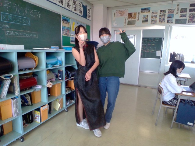 日本と関わりのある国について調べました。ある子は、中国のチャイナドレスを着ていました。様々な国の政治や文化について学習を進めています。