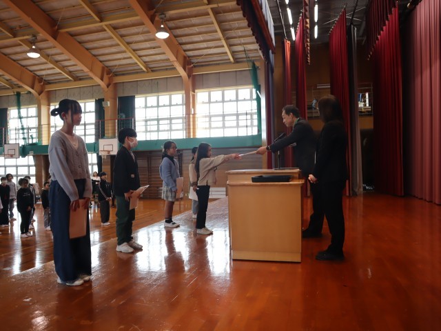 令和6年度の修了式を行いました。校長先生から「人や物となかよしになる」ことや「様々なことにチャレンジする」ことについて話を聞き、この一年間の自分の学びを振り返っている子供たちでした。また、話を聞く態度や修了証を受け取る代表児童の姿から子供たちの成長を感じられる式となりました。4月から進級した学年でがんばる姿が今から楽しみです。