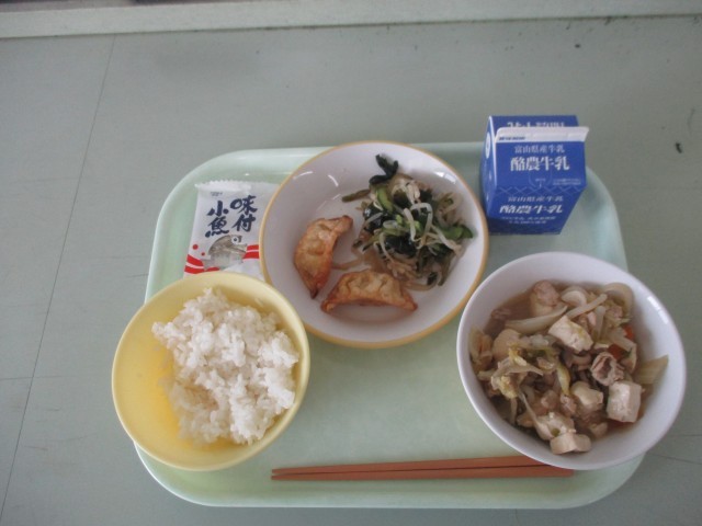 今日の献立は、ごはん、あげぎょうざ 、かいそうサラダ、にくどうふ、あじつけこざかな です。