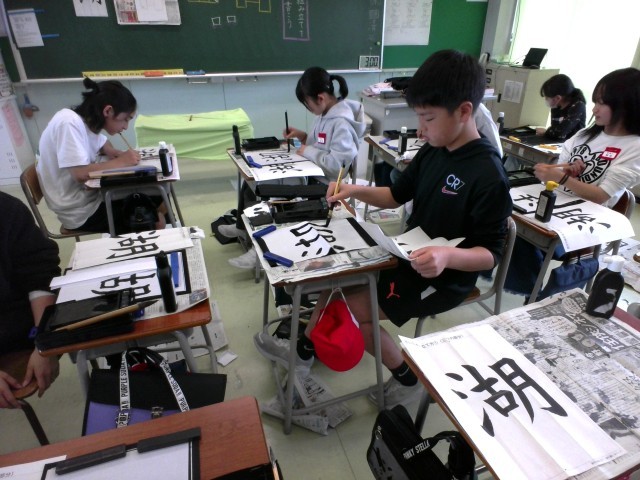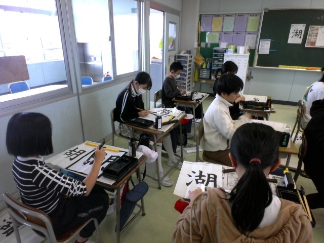 毛筆で「湖」を書きました。子供たちは部分の組み立て方を意識して、丁寧に作品を書き上げました。