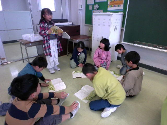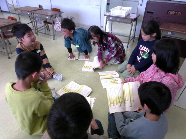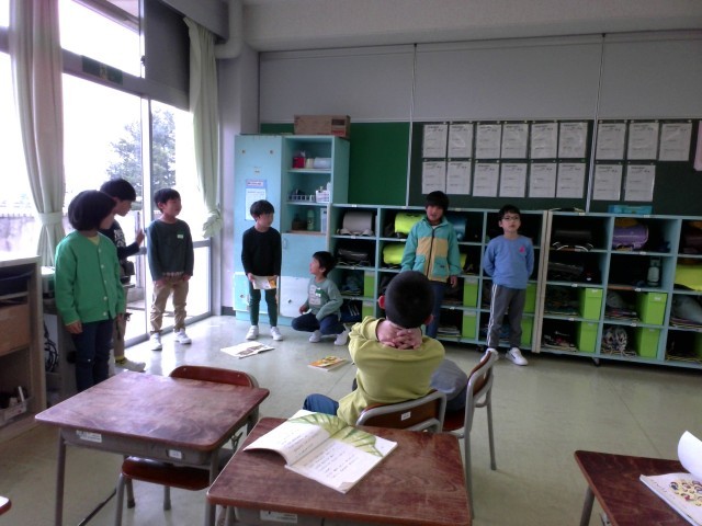 国語科で、「ふきのとう」の音読劇の練習をしました。たくさん出てくる登場人物の配役を決め、グループに分かれて練習しました。練習のあとに互いに聞き合い、よいところを見つけたり次の練習の目当てをもったりしました。