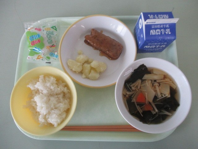 今日は、「子どもの日 献立」です。献立は、ごはん、こいのぼりハンバーグ、 こふきいも 、わかたけじる 、かしわもち です。