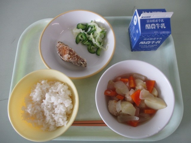 今日の献立は、ごはん、あじのからあげ、 きざみあえ、 わふうポトフ です。