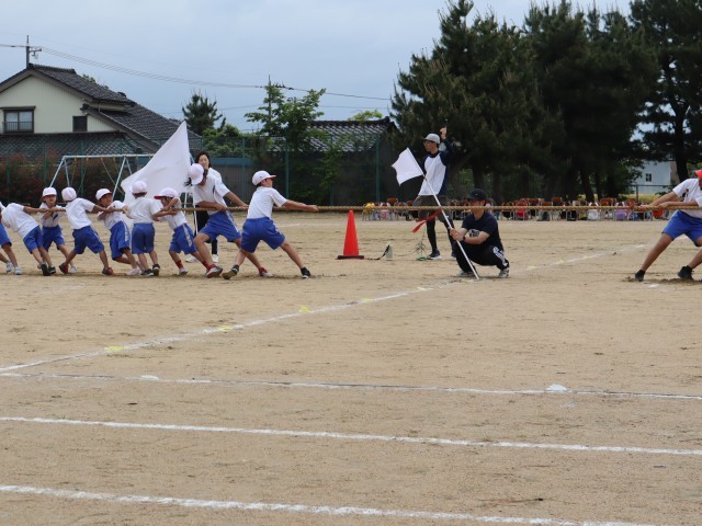 風にも負けず、どちらの団も協力して綱を引き合いました。