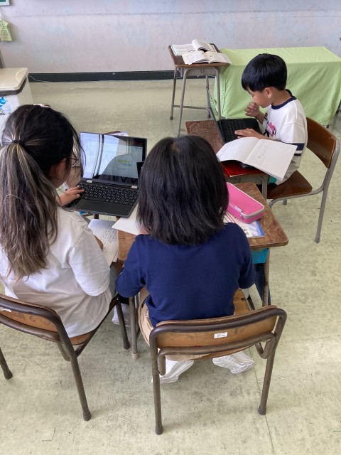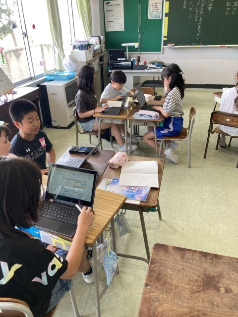 国語科で「聞き取りメモのくふう」の学習では、「今年度草島小学校に来られた先生にインタビューをして、全校みんなに紹介しよう」というゴールに向かって意欲的に取り組んでいます。今日は実際に担任にインタビューをし、聞き取りメモをつくり、スライドにまとめました。どのように聞き取りメモを工夫したらよいのか、どのようにスライドにまとめたら伝わるのかを試行錯誤していました。