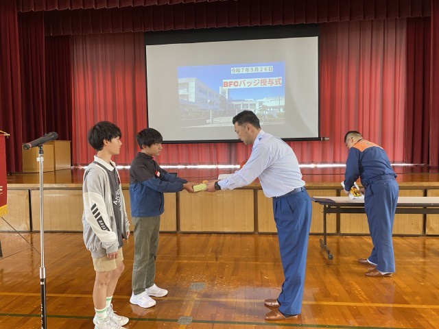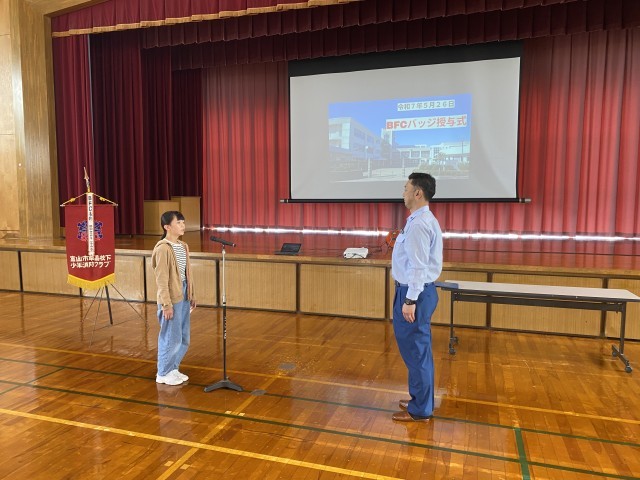 BFCバッジ授与式と防災教室を行いました。富山北消防署和合出張所の方よりBFC会員の証であるバッジをいただき、これから防災について詳しく学習していく意欲を高めました。