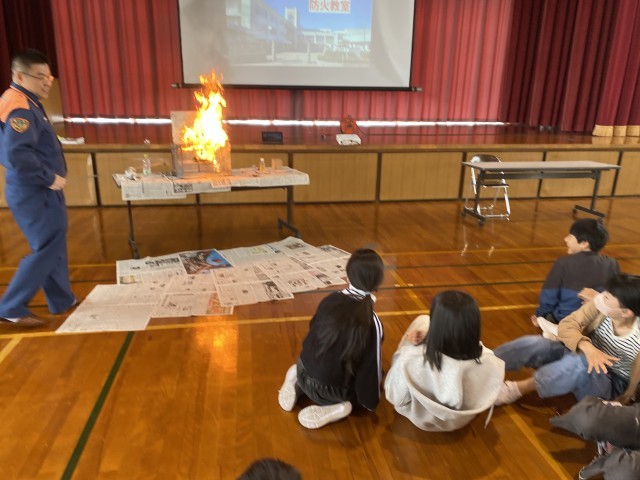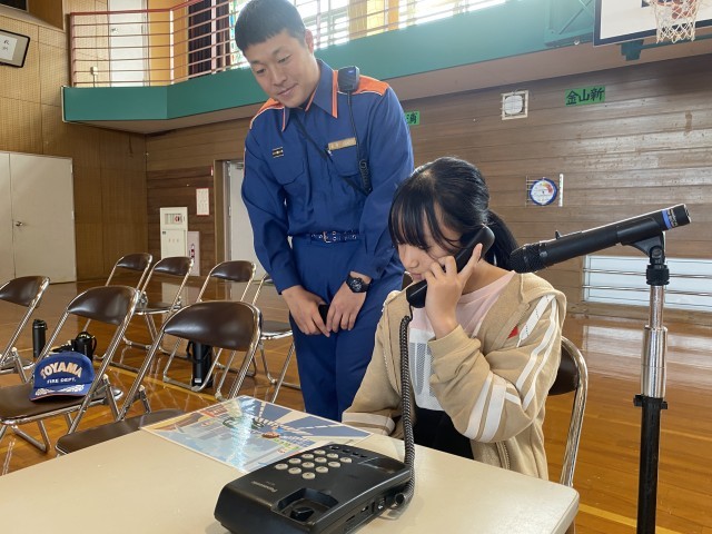 防火教室では、電話機を使って119番のかけ方を確認したり、天ぷら油火災の実験を見たりしました。体験や実験を通して、防災についての知識を高めることができました。
