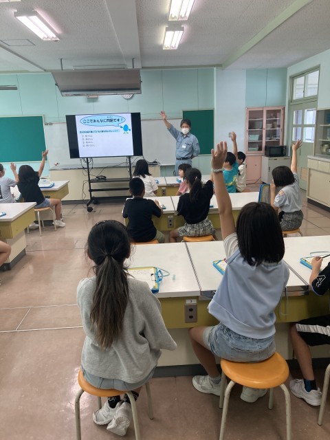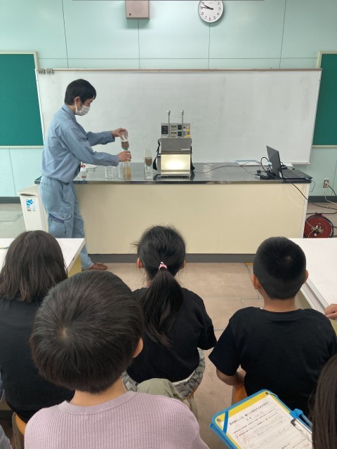 流杉浄水場で働く方々をお招きして、浄水場の役割や浄水場で働く人々の思いを聞きました。お話や実験を通して、「きれいで安全な水を届けるために、何度も消毒している」「ぼくたちにできることはなるべく川をきれいに使うことだ」などと、教科書の学びをもとに、実感を伴って理解をした子供たちでした。