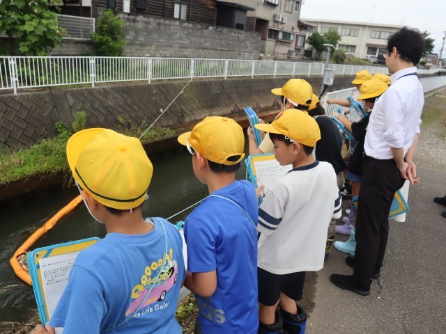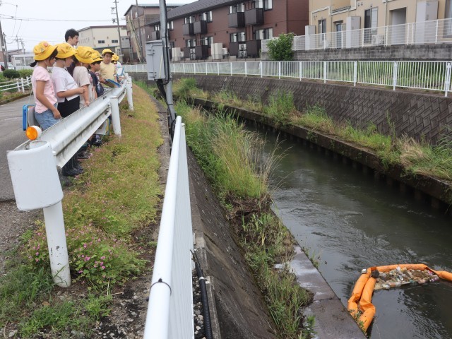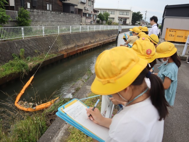 富山市環境部環境政策課の事業の一つとして「海洋ごみに関する小学生への特別授業」に4年生が参加しました。まずは、がめ川に設置してあるオイルフェンスを見学しました。川にどれくらいの量のごみが流れてきているのか、どのような種類のごみが流れているのかを知りました。川が汚れている様子を実感する子供たちでした。