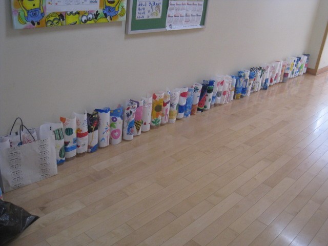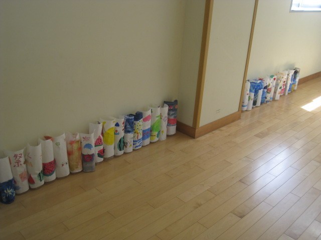 体育館に行く廊下に「ミニあんどん」が並んでいました。昨日、ファミリー班でつくっていたあんどんです。これが八重津浜に飾られる「だらまつり」は、7月27日です。