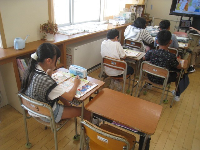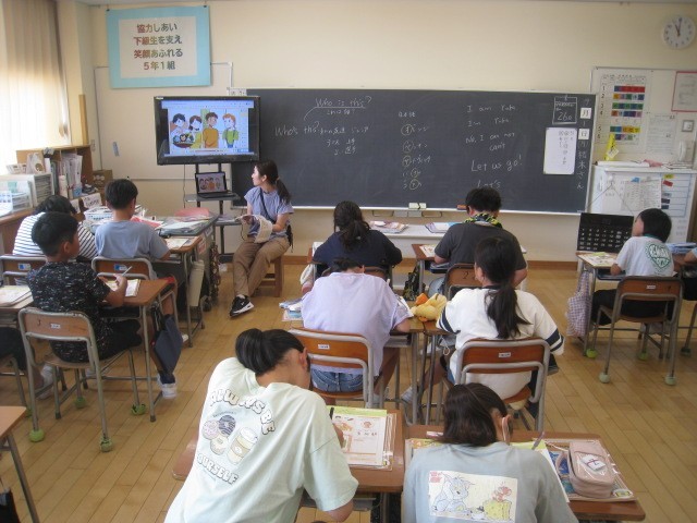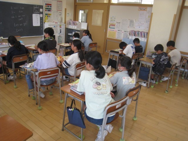 5年1組の3時間目は、外国語科の学習でした。家族のことを紹介する文について考えていました。