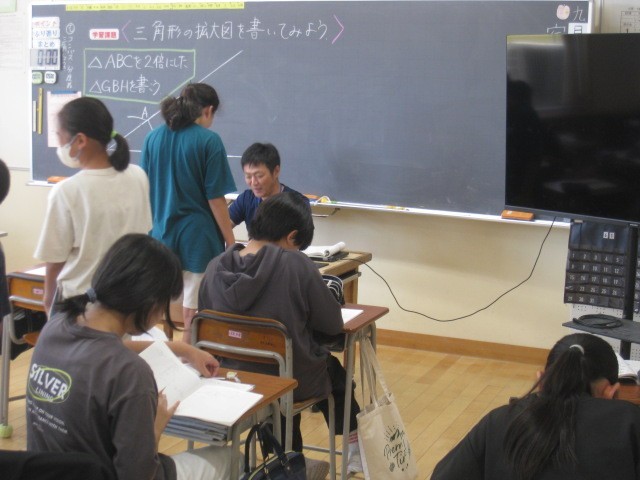 6年生の3時間目は、算数科の学習でした。三角形の拡大図を描いていました。