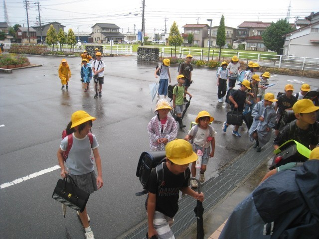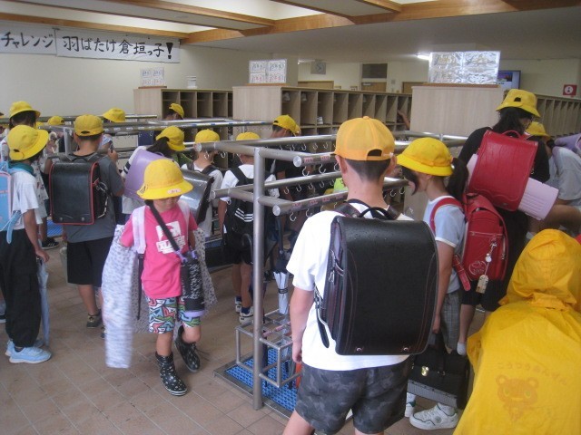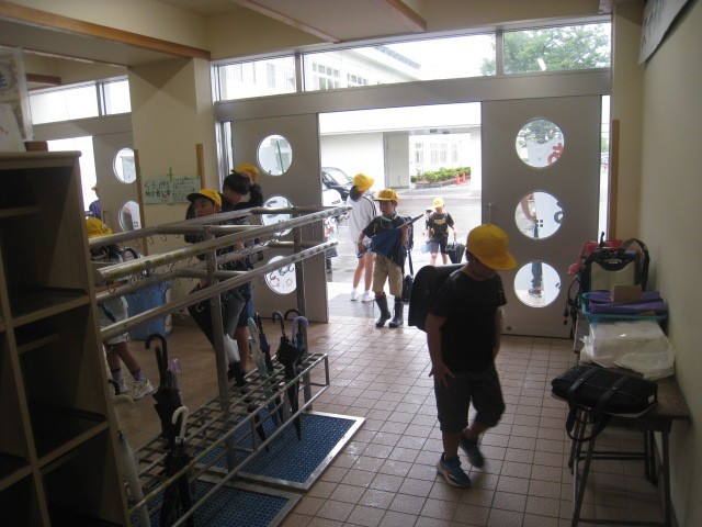 今朝の児童玄関の様子です。雨の朝です。子供たちの挨拶もちょっぴり元気がありませんでした。残念。