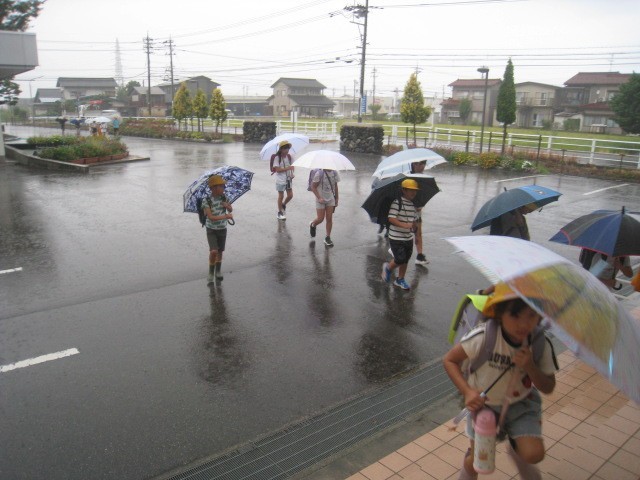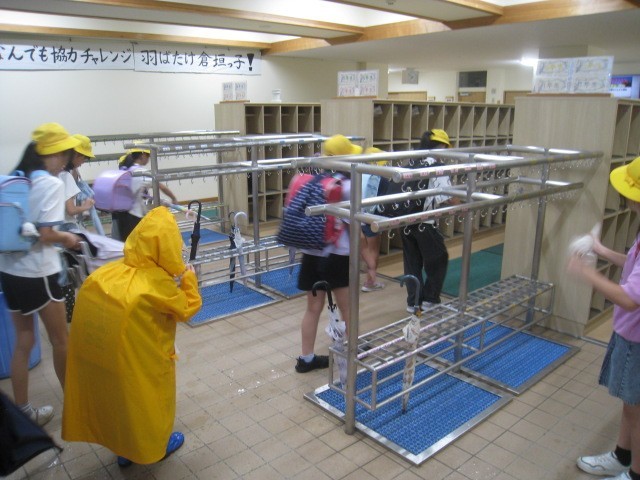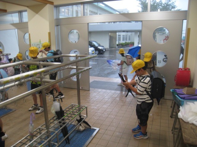 今朝の児童玄関の様子です。ちょっぴり強めの雨が降っていました。子供たちの挨拶は元気でした。