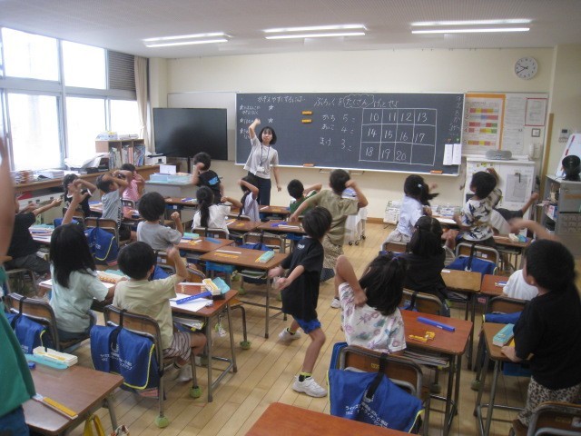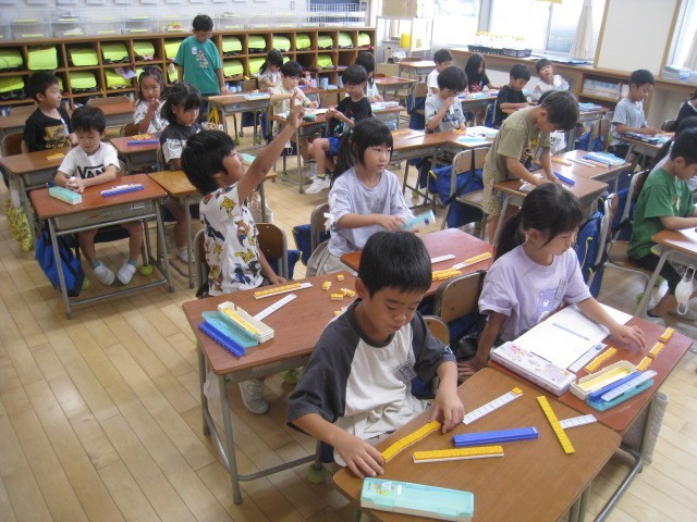 1年生の2時間目は、算数科の学習でした。ブロックをたくさん集めて、数えやすくする方法を考えるところでした。