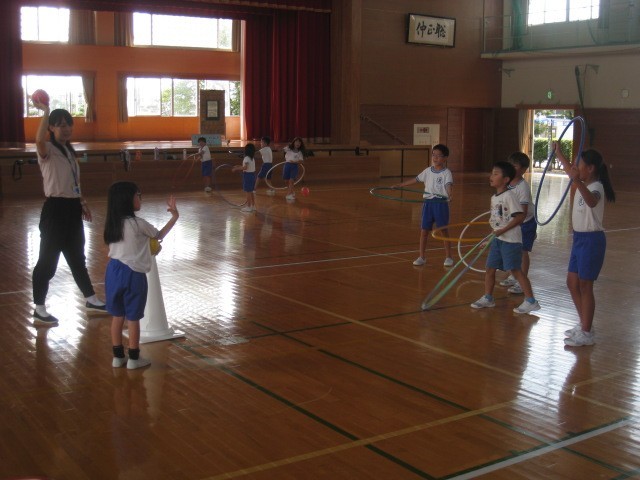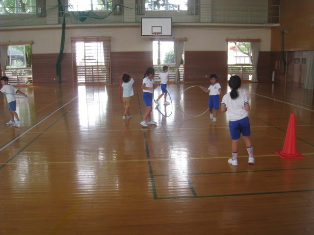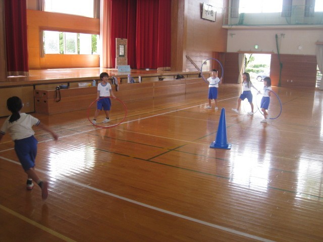 2年生の5時間目は、体育科の学習でした。フラフープとボールを使って段ごとに活動していました。