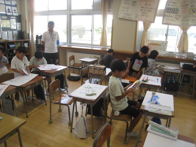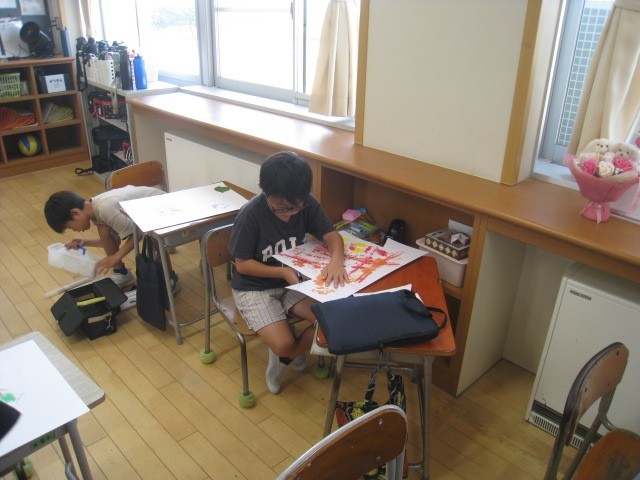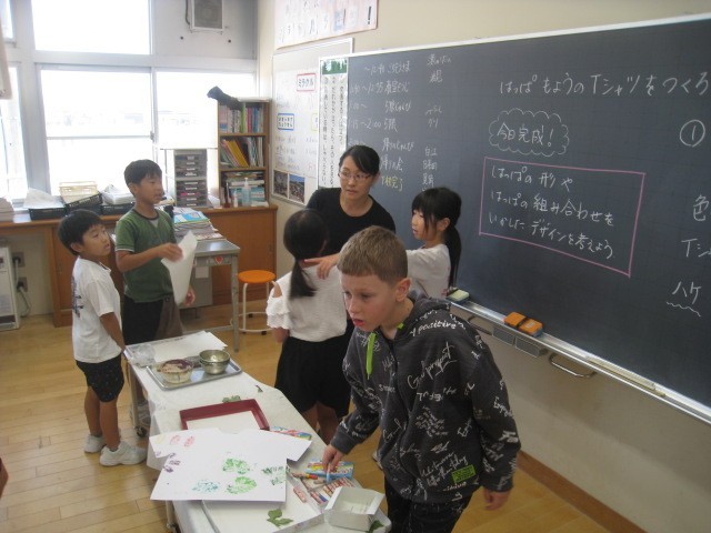 3年生の1時間目は、図画工作科の学習でした。葉っぱの型押ししたものをTシャツの形に切っていました。