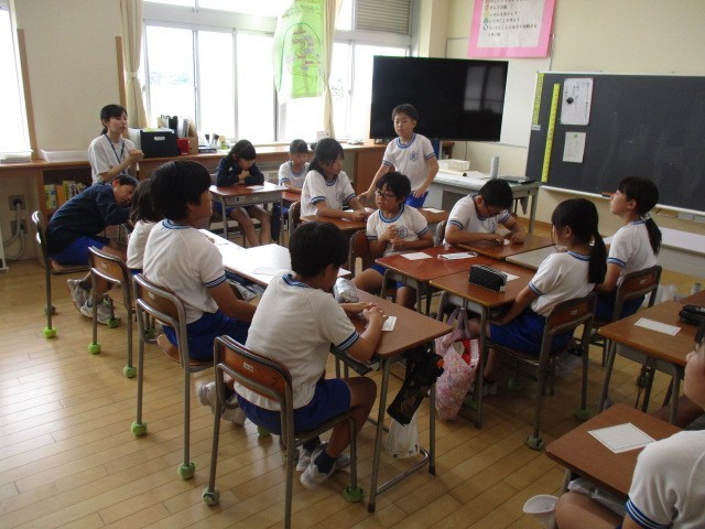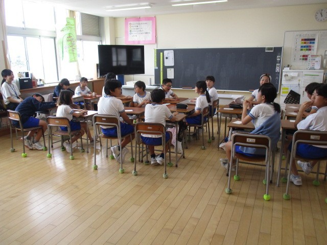 5年2組は、3時間目にみんなで相談していました。さっき見た3・4年生の「せかいがひとつになるまで」について、どうやって思いを伝えようかについて、みんなで話し合っていました。
