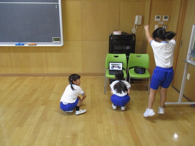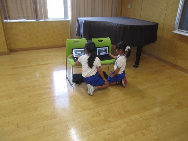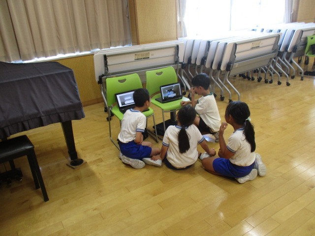 2年生は、3時間目に音楽室で学習発表会の練習をしていました。グループごとに動画で確認しながら練習していました。