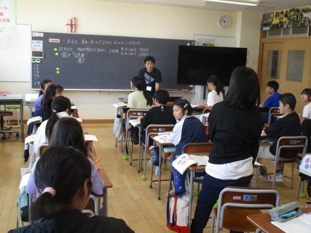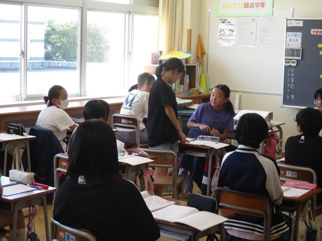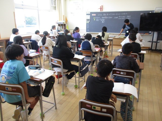 6年生の3時間目は、算数科の学習でした。人口ピラミッド(グラフ)を見て、考えたことを友達に伝えていました。
