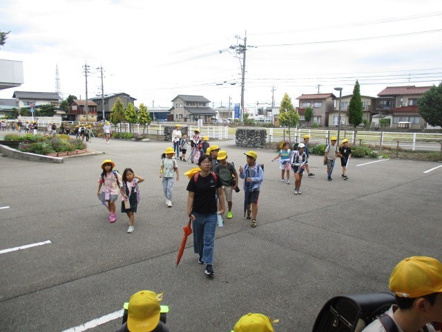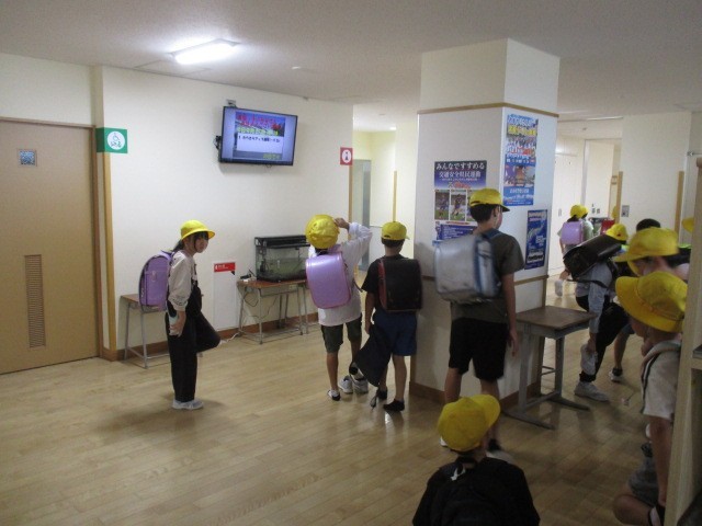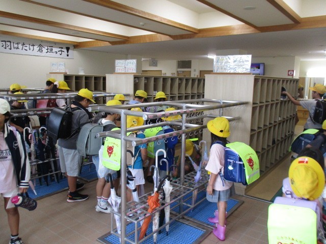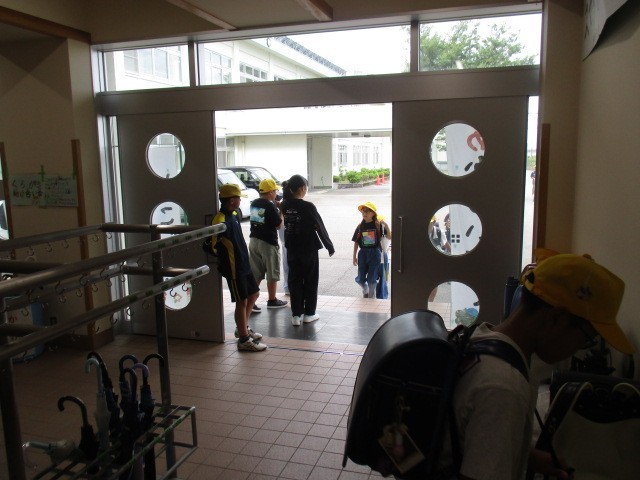 今朝の児童玄関の様子です。曇り空の少し風のある朝です。子供たちが元気に登校してきました。