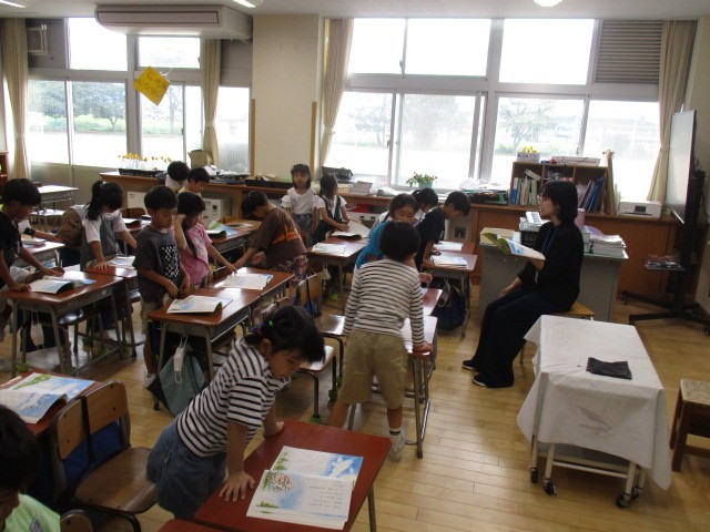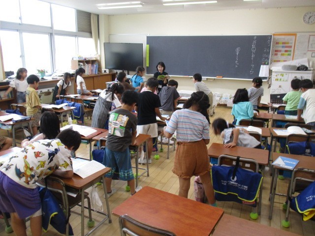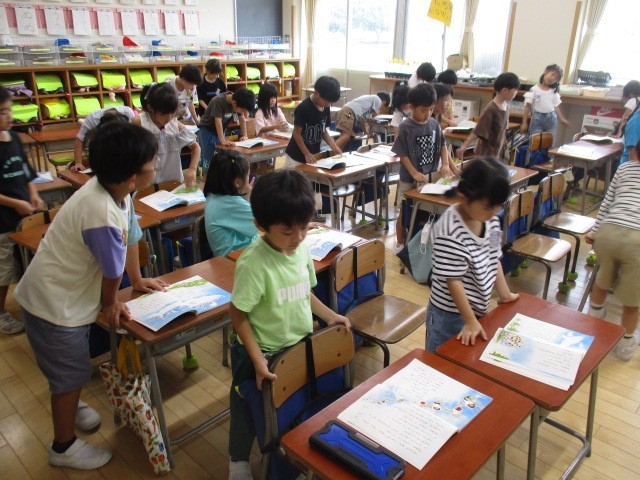 1年生の5時間目は、国語科の学習でした。「くじらぐも」というお話の音読をしていました。