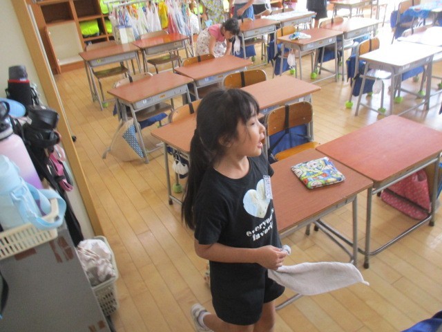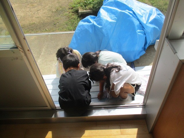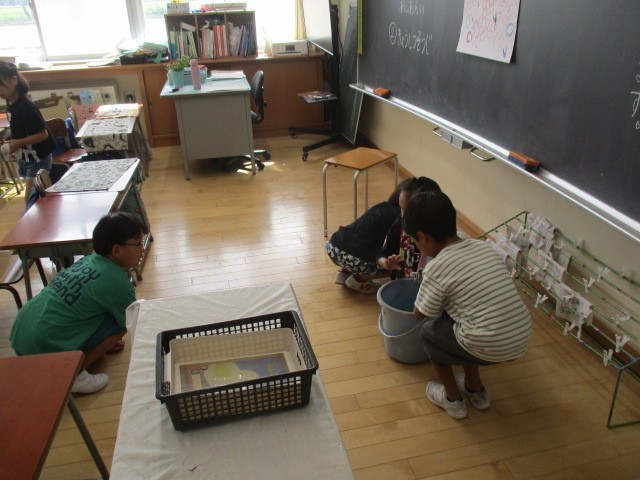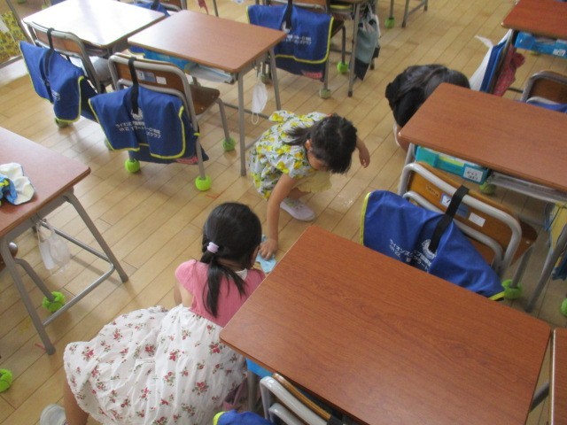 5時間目に1年生教室に行くと、みんなで掃除をしていました。3・4時間目の楽しかった時間の後片付けをしていました。