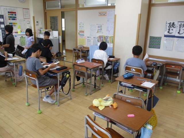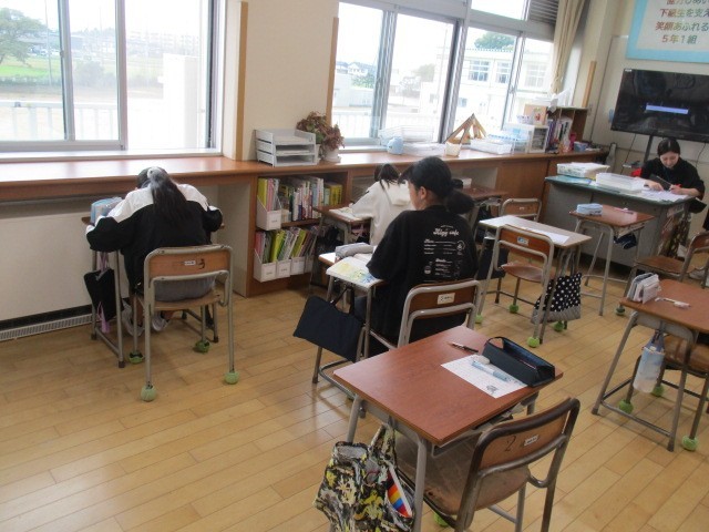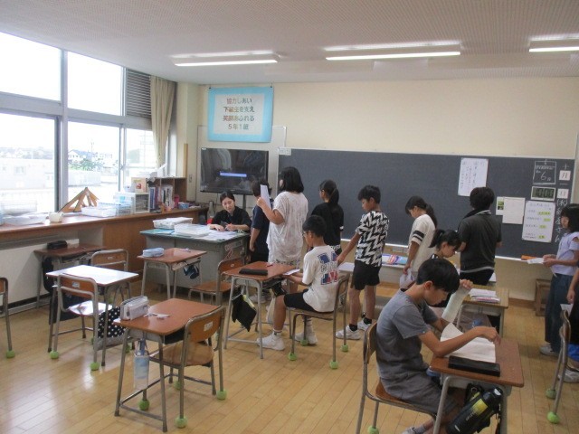 5年1組の1時間目は、国語科の学習でした。漢字の小テストのプリントを終わった人から先生にチェックしてもらっていました。