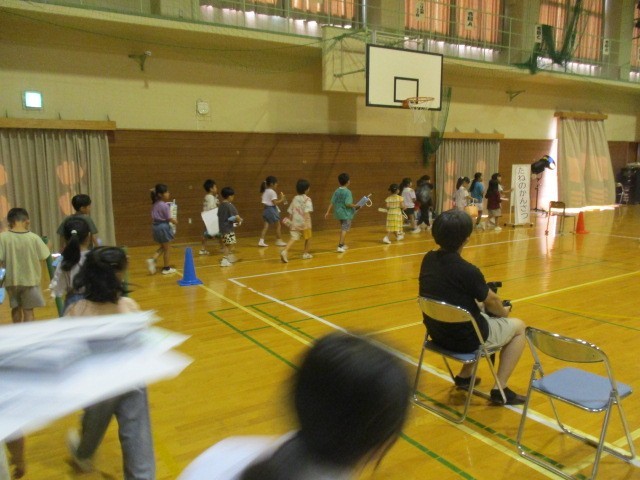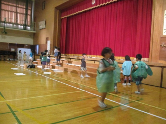 今日は、学習発表会の予行練習(校内発表会)の日です。本番と同じ時間に子供たちが体育館に集まってきました。1年生は、はじめの位置に並び始めました。