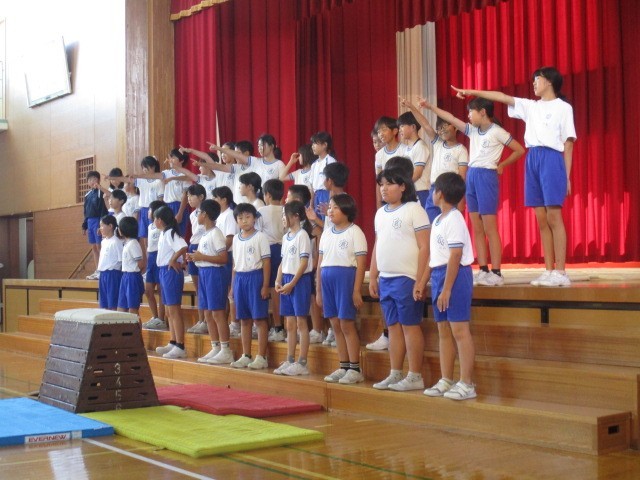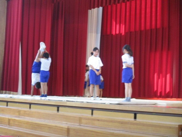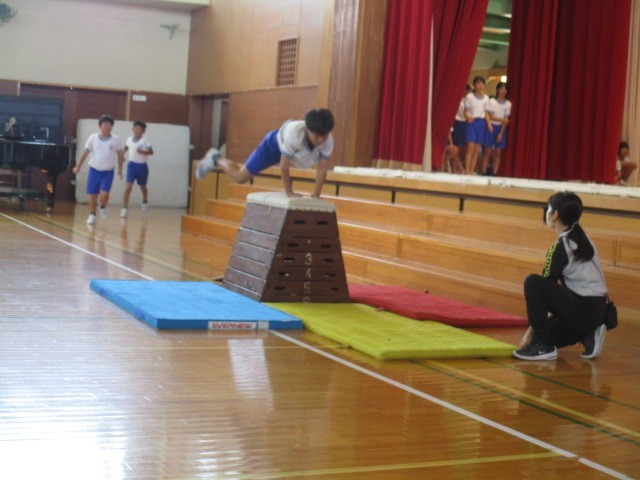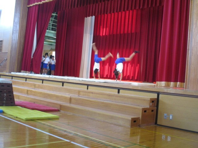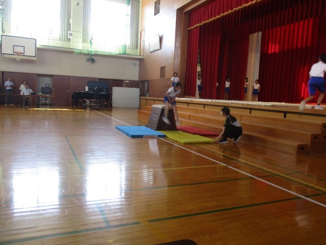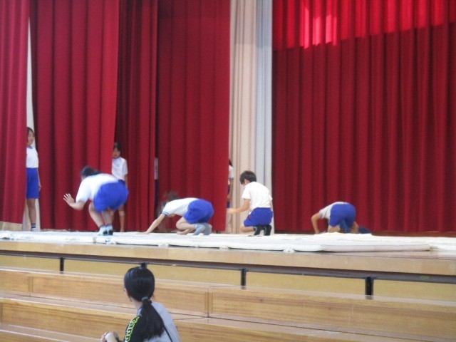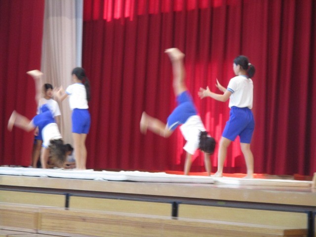 5年生の発表の様子です。団ごとに考え練習したマット運動をしたり、みんなでダンスを踊ったりしていました。