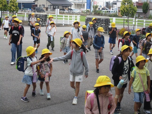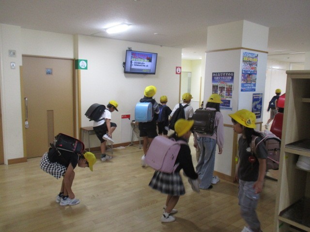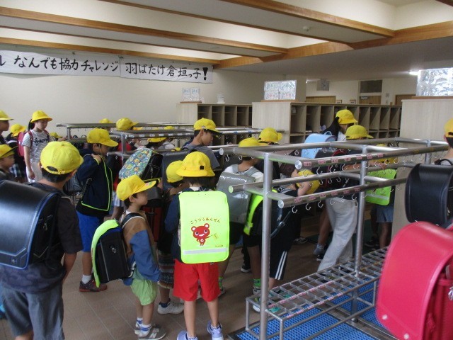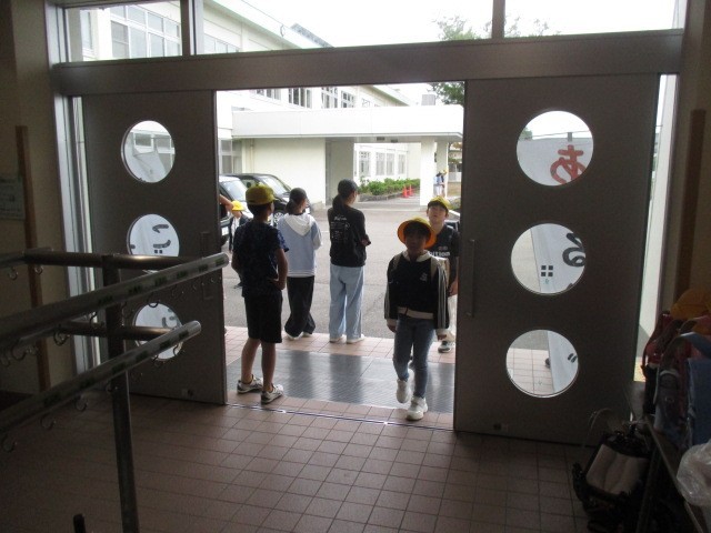 今朝の児童玄関の様子です。曇り空です。子供たちが元気に登校してきました。