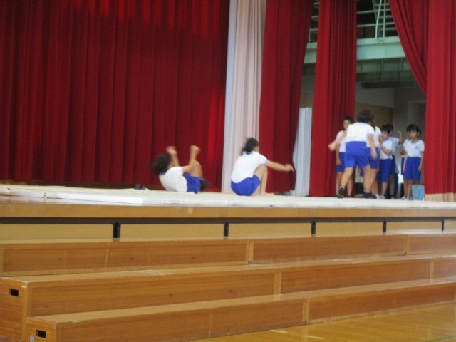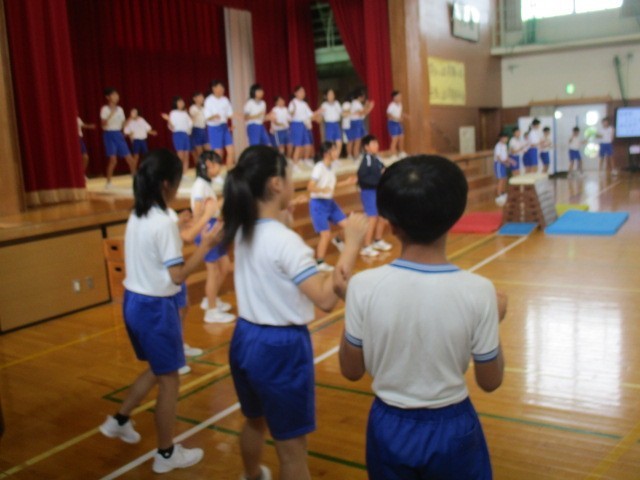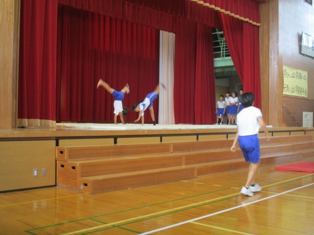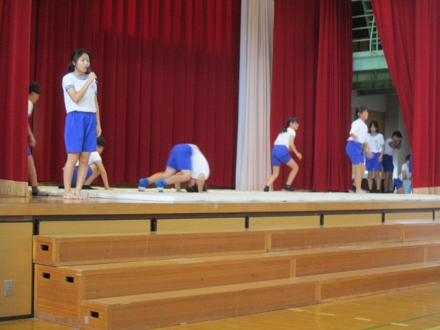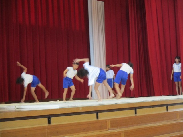 5年生の発表の様子です。団ごとに、BGMの曲目、表現する技やそのつながりを考えたそうです。団それぞれの個性が見られるショータイムでした。