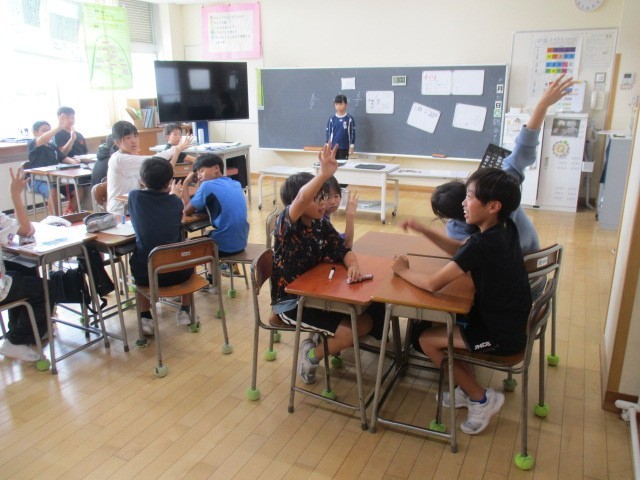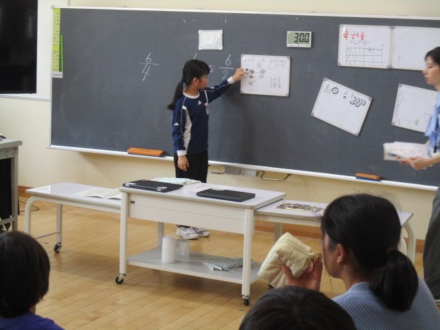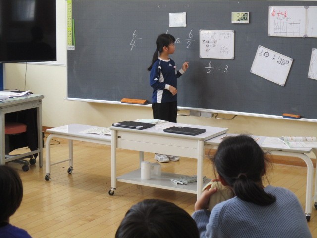 5年2組の3時間目は、算数科の学習でした。「2分の6」が「3」になることをみんなに説明していました。