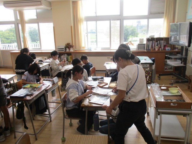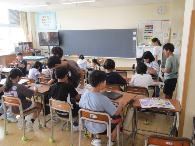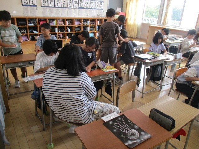 5年1組の5時間目は、図画工作科の学習でした。針金アートが終わった人から「消してかく絵」をかいていました。