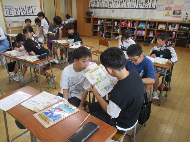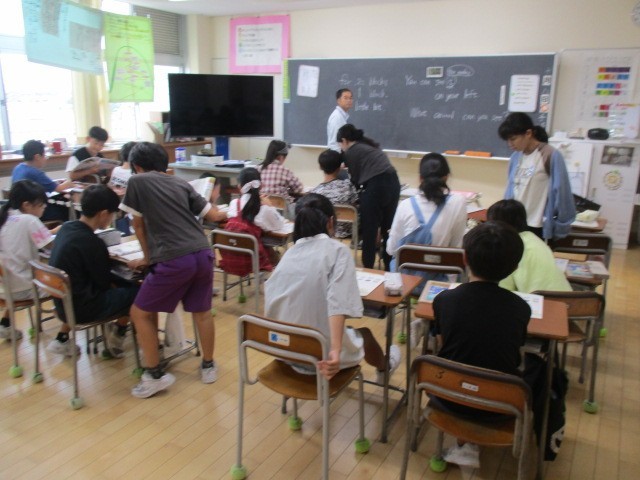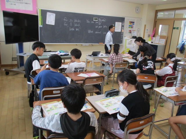 5年2組の1時間目は、外国語科の学習でした。「ターンレフト」や「ゴーストレイト」などの指示を聞いて、地図の上の指示された場所について考えていました。