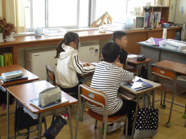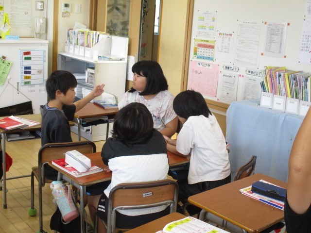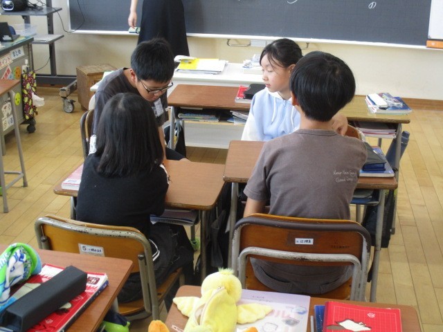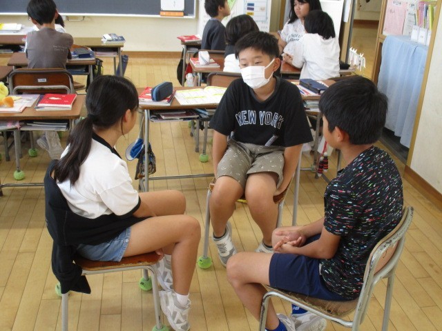 5年1組の1時間目は、話合いの時間でした。グループごとに「よりよい学校生活」について話し合っていました。