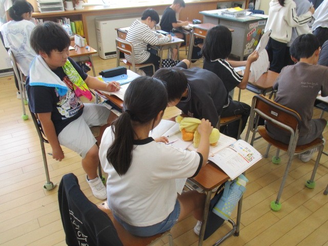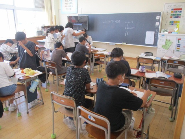 5年1組の3時間目は、算数科の学習でした。練習問題を解いた人から先生にチェックしてもらっていました。