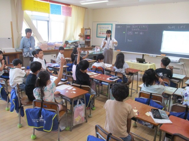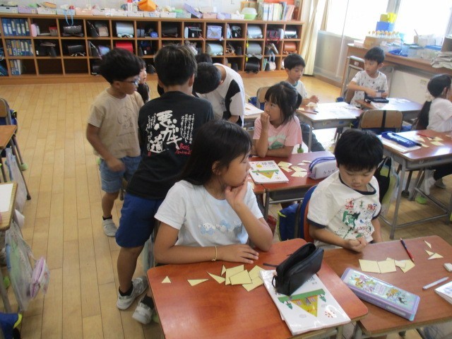 2年生の1時間目は、算数科の学習でした。「さんかく」「しかく」について話し合っていました。